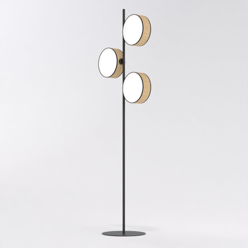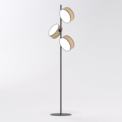 Modern floor lamp with a stylish design from the series Drumz, made of black colour metal base and three adjustable cylindrical natural rattan shades. An original proposal for comfortable lighting in your living room, dining room, bedroom, hotel and restaurant.