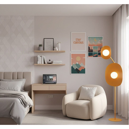 Stylish floor lamp with an original design from the series Delulu, made of an orange colour round metal base with an arm and two asymmetrical metal bodies with opal glass spherical diffusers. Modern addition to the interior lighting of your living room, dining room, bedroom, office, hotel and restaurant.