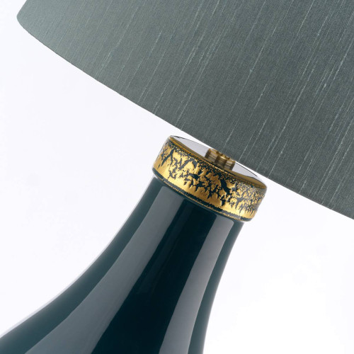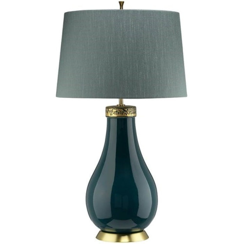 Classic table lamp with exquisite design, made of azure-turquoise ceramic base with cracked gold glaze on top, colour antique brass metal element and green textile shade. Stylish offer for lighting in your living room, dining room, bedroom, office, hotel and restaurant.