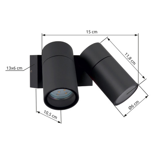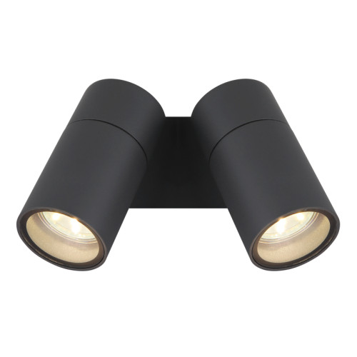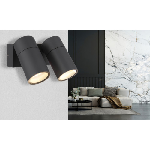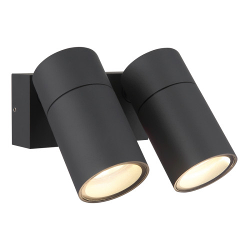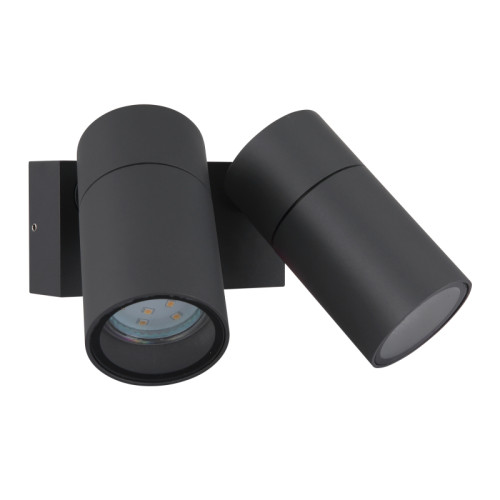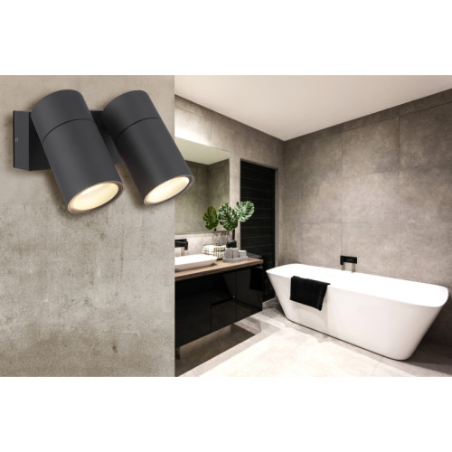 Modern spot lamp from the series Piper with a high degree of ingress protection: IP44, made of an anthracite colour rectangular aluminium base and two adjustable aluminium heads in a cylindrical shape with transparent glass diffusers on a GU10 socket. A functional lamp, suitable for high-quality and comfortable lighting of your bathroom, facade, porch and terrace.
