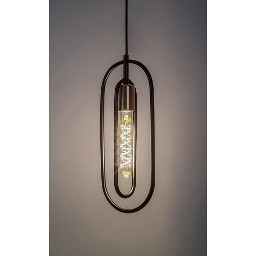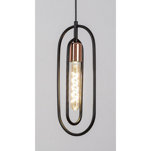 Stylish pendant lamp with an original design from the series Rovier, made of a matt black colour metal base and hanging body, consisting of two elliptical metal frames with copper colour metal bulb holder on an E27 socket. Modern proposal for comfortable lighting in your living room, dining room, bedroom, hotel and restaurant.