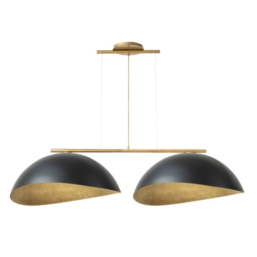 Attractive pendant lamp with a modern design from the series Solar, made of a gold colour steel base and an arm with two asymmetric shades made of mineral composite in black colour on the outside and gold colour on the inside. Original lamp that will fill with comfort and soft light your living room, dining room, bedroom, hotel and restaurant.