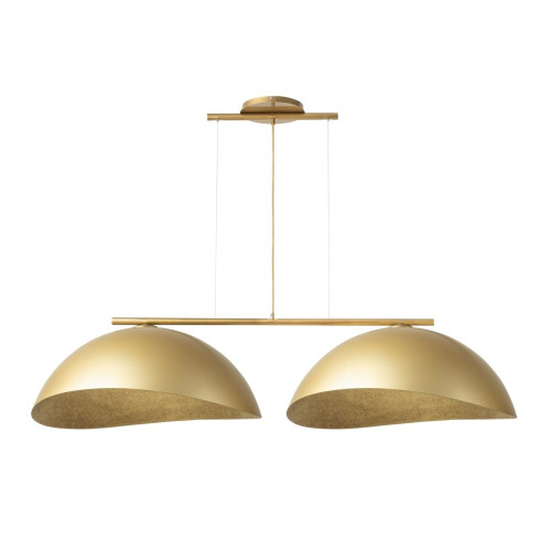 Attractive pendant lamp with a modern design from the series Solar, made of a gold colour steel base and an arm with two asymmetric shades made of mineral composite in gold colour. Original lamp that will fill with comfort and soft light your living room, dining room, bedroom, hotel and restaurant.