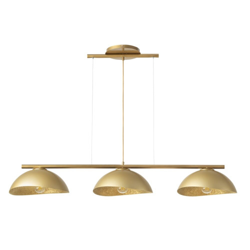 Attractive pendant lamp with a modern design from the series Solar, made of a gold colour steel base and an arm with three asymmetric shades made of mineral composite in gold colour. Original lamp that will fill with comfort and soft light your living room, dining room, bedroom, hotel and restaurant.