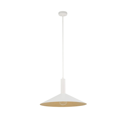 Modern pendant lamp with an elegant design from the series Capri, made of a white colour steel base and a conical shade of mineral composite in white colour on the outside and gold on the inside. Hanging lamp, suitable for stylish and quality lighting of your living room, dining room, bedroom, hotel and restaurant.