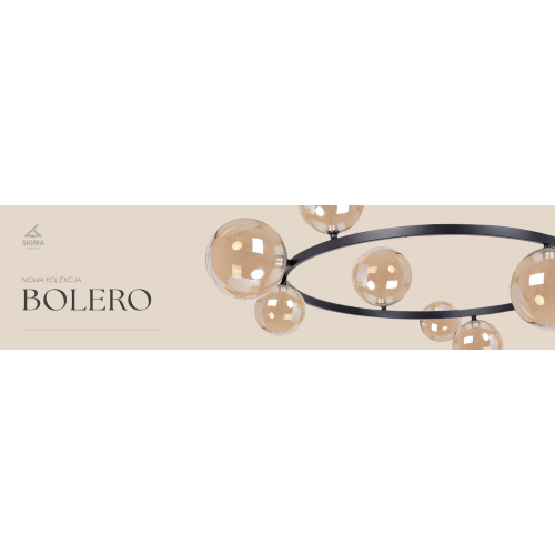 Stylish pendant lamp with an original design from the series Bolero, made of a steel base and a black colour hanging body in the shape of a ring with twelve amber colour spherical glass shades. Modern proposal for interior lighting of your living room, dining room, bedroom, hotel and restaurant.