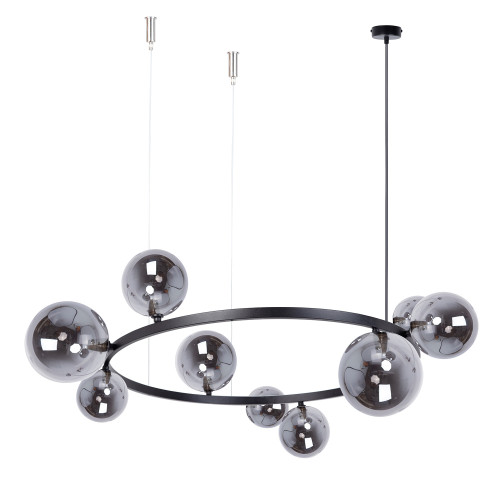 Stylish pendant lamp with an original design from the series Bolero, made of a steel base and a black colour hanging body in the shape of a ring with nine graphite colour spherical glass shades. Modern proposal for interior lighting of your living room, dining room, bedroom, hotel and restaurant.