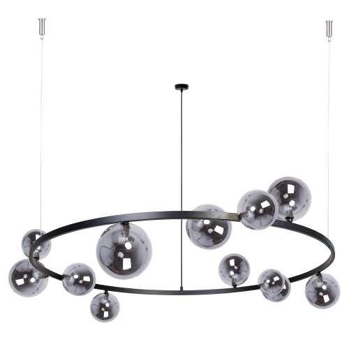 Stylish pendant lamp with an original design from the series Bolero, made of a steel base and a black colour hanging body in the shape of a ring with twelve graphite colour spherical glass shades. Modern proposal for interior lighting of your living room, dining room, bedroom, hotel and restaurant.