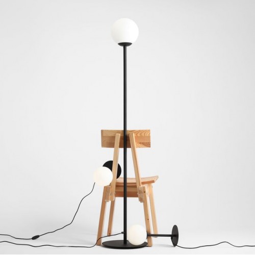 Modern floor lamp with a minimalist design from the series Pinne, made of a black colour round metal base with a long arm and a white spherical glass shade on an E27 socket. An original proposal for comfortable and stylish lighting for your living room, dining room, bedroom, office, hotel and restaurant.