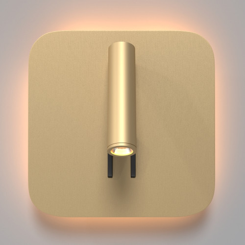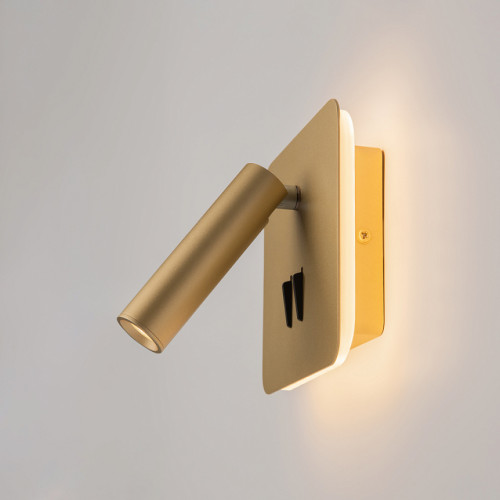 Functional LED wall lamp made of matt golden colour square metal base with adjustable cylindrical metal head in golden colour. A lamp that will fill with warm white light and modern atmosphere your living room, bedroom, corridor, hotel or restaurant.