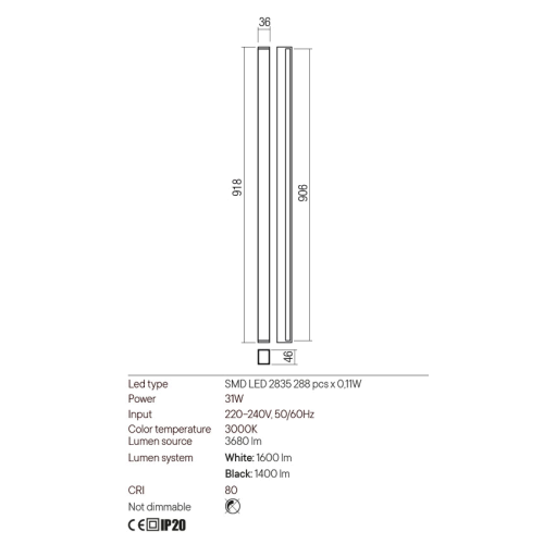 Dimensions: Height: 36mm, Length: 918mm, Distance from the wall: 46mm