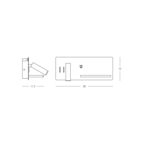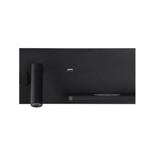 Functional LED wall lamp with innovative design, made of matt black colour rectangular metal body with white plastic diffuser and additional adjustable aluminium head with built-in 6W + 3W 3000K LED. Original lamp with built-in switches: ON/OFF, wireless charger and USB ports (type C and type A), suitable for quality lighting of your home and hotel.