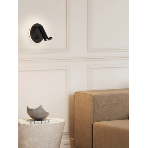 Stylish LED wall lamp with an innovative design, made of a matt black colour round aluminium base with an acrylic diffuser, indirectly illuminated and adjustable cylindrical LED head with a built-in 3W + 6W, 3000K LED. Wall lamp with two built-in switches ON/OFF, which will fill your bedroom, office, hotel or restaurant with quality light and a modern atmosphere.