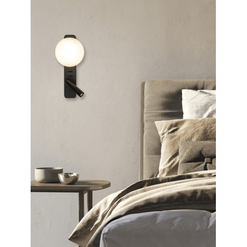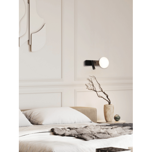 Modern LED wall lamp with stylish design, made of matt black colour rectangular metal base with opal glass diffuser on G9 socket and adjustable LED aluminium head with built-in 3W 3000K LED. Original lamp with built-in switches: ON/OFF, suitable for quality lighting of your home and hotel.