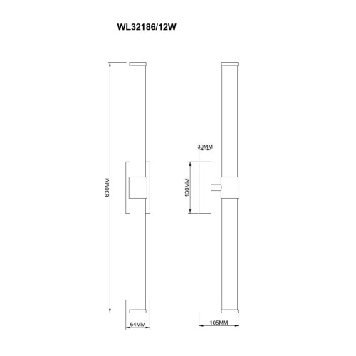 Dimensions: Width: 64mm, Height: 630mm, Distance from the wall: 105mm
