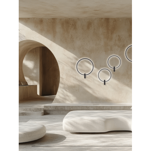 Stylish LED wall lamp with a modern design, made of a matt black colour metal base and an aluminium body in the shape of a ring with an acrylic diffuser and a built-in 23W, 3000K LED. Wall lamp, suitable for the original lighting of your living room, dining room, bedroom, hallway, hotel or restaurant.