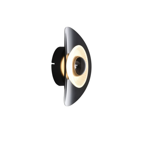 Original LED wall lamp from the series Diop, made of a black colour round metal base and a black chrome metal shade with a transparent glass diffuser and a built-in 8W 3000K LED with the ability to dim via a wall switch. Modern solution for comfortable lighting of your living room, dining room, bedroom, hotel or restaurant.