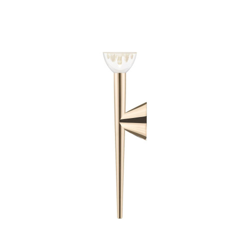 Stylish LED wall lamp from the series Boston, made of a gold colour metal base and metal body in a conical shape with transparent plastic diffuser and a built-in 5W 3000K LED. Modern solution for comfortable lighting of your living room, dining room, bedroom, hallway, hotel or restaurant.