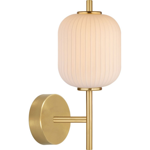 Modern LED wall lamp from the series Akari, made of a brass colour metal base with a white ribbed glass diffuser and a built-in 6.5W LED with the ability to select the colour temperature: 3000K/4500K/6000K and dimmable via a wall switch. Stylish proposal for the interior lighting of your living room, dining room, bedroom, hotel and restaurant.