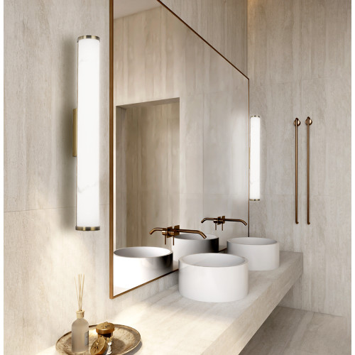 Modern LED wall lamp with a high degree of ingress protection: IP44, made of a copper colour metal base and a white resin diffuser in a cylindrical shape and a built-in 16W, 3000K LED. Stylish lamp, suitable for quality lighting in your bathroom or wet room.