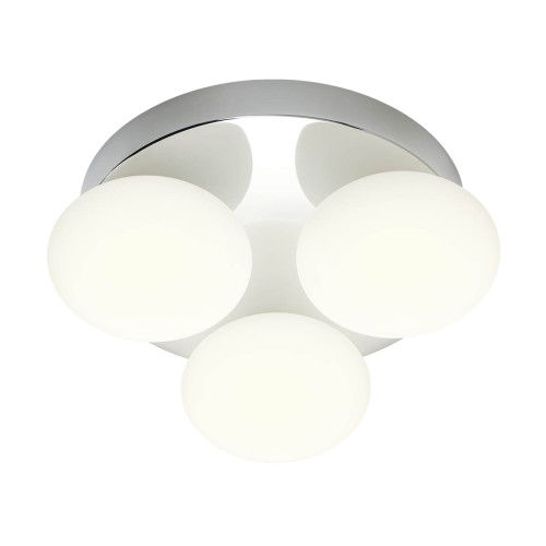 Modern LED bathroom ceiling lamp with a stylish design from the series Ovum, made of a chrome colour round aluminium base and three opal white glass shades in an oval shape with a built-in 3 x 5W LED with the ability to select the colour temperature: 3000K/4000K and a high degree of ingress protection: IP44. An original proposal for the interior lighting in your bathroom and wet room.