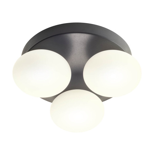 Modern LED bathroom ceiling lamp with a stylish design from the series Ovum, made of a matt black colour round aluminium base and three opal white glass shades in an oval shape with a built-in 3 x 5W LED with the ability to select the colour temperature: 3000K/4000K and a high degree of ingress protection: IP44. An original proposal for the interior lighting in your bathroom and wet room.