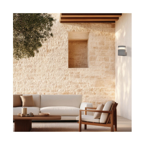 Stylish LED facade wall lamp, made of metal and concrete in a cylindrical shape with a transparent glass diffuser and built-in 20W, 3000K LED. Original lamp with a high degree of ingress protection: IP65, suitable for quality and cozy lighting of the garden, facade and porch in your home, villa, hotel and restaurant.