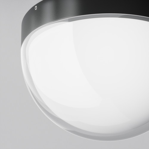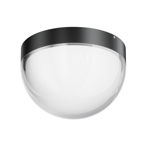 Modern LED facade ceiling lamp, made of graphite colour aluminium base with matt white acrylic diffuser inside and transparent plastic shade in dome shape outside with built-in 12W, 3000K LED. Stylish lamp with a high degree of ingress protection: IP54, suitable for the outdoor lighting of your facade, porch or terrace.