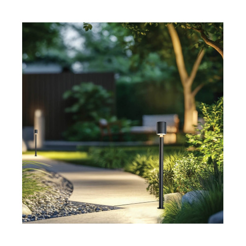 Original LED garden bollard lamp, made of matt black colour aluminium body and cylindrical aluminium head with tempered glass diffuser and built-in 8W, 3000K LED. Stylish outdoor lamp with a high degree of ingress protection: IP65, suitable for high-quality and comfortable lighting of the garden, park and alley in your home, villa, hotel and restaurant.