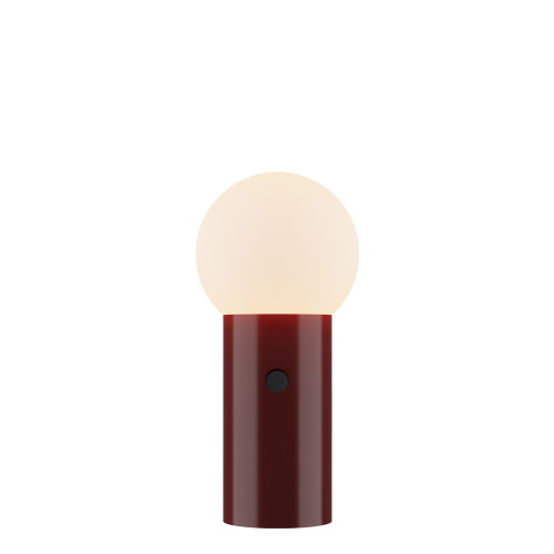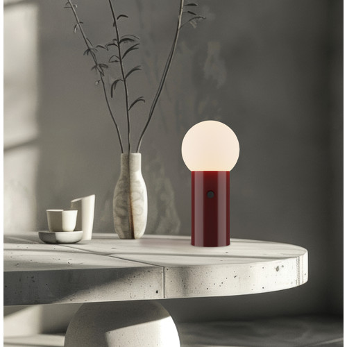 Contemporary LED table lamp from the series Ratu, made of a red colour metal body with a built-in touch dimmer switch and opal glass shade in spherical shape with built-in 8W, 3000K LED. Stylish lamp, suitable for lighting in your bedroom, living room, office, hotel and restaurant.