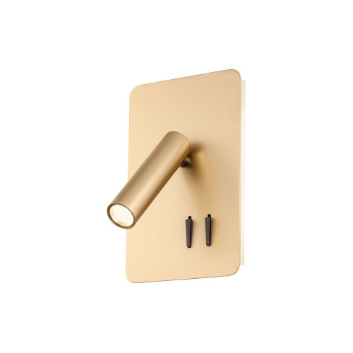 Functional LED wall lamp with modern design, made of matt gold colour metal base with lateral diffuser in satin polycarbonate and an additional LED metal arm in a cylindrical shape. Original lamp with a USB port for charging and two switches ON/OFF, suitable for interior lighting in your bedroom, office or hotel.