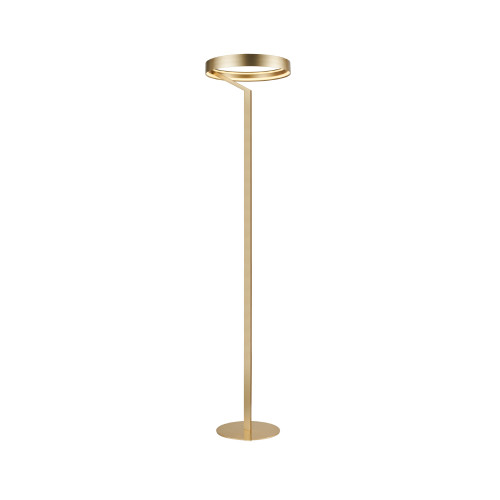 Stylish and modern led floor lamp from series Rollie, made of satin brass colour round metal base and arm with round shade with indirect lighting distributions, with integrate 42W LED, 2700K, 2150lm with dimmable driver. Floor lamp, suitable for your living room, bedroom, dining room, hotel and restaurant.