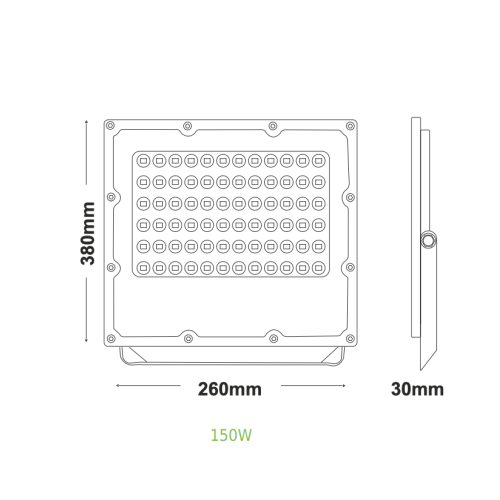 Modern ultra slim LED projector with high ingress protection IP65, with consumption of 150W, 18000lm, 4000K, beam angle 90º . Made of black colour aluminium body with transparent plastic diffuser with high UV protection. Quality light suitable for the exterior lighting of your store, workshop, garage, facade or garden.