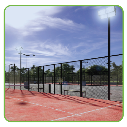 Functional LED flood luminaire with high ingress protection IP66, with consumption of 720W SMD, 111600lm, 5000K, beam angle 40º. Made of black colour rectangular aluminium body with transparent plastic diffuser with high UV and IK protection. Quality light, suitable for the exterior lighting of your sports ground and tennis ground.