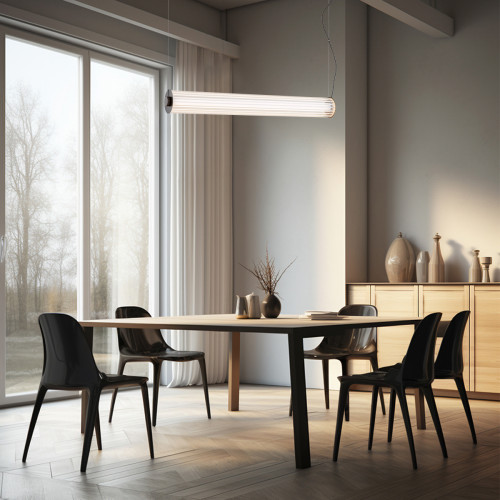 Contemporary LED pendant lamp from the series Hampton, made of a titanium colour metal base and a horizontal hanging body made of metal with a fluted transparent glass diffuser in a cylindrical shape and a built-in 60W, 3000K LED. Stylish proposal for the interior lighting of your living room, dining room, hotel and restaurant.