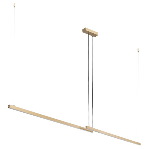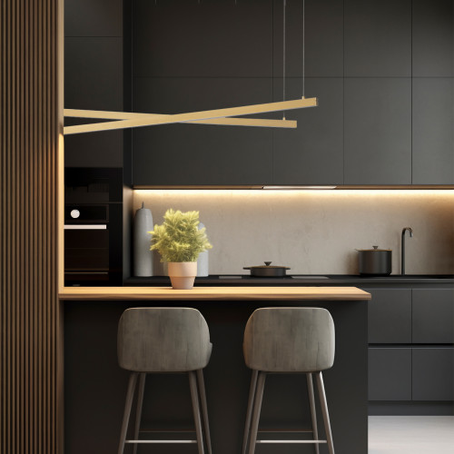 Modern LED pendant lamp from the series Miami, made of a gold colour metal base and two hanging rectangular metal bodies with built-in 74W LED, 3000K and two-sided light distribution. Stylish proposal for comfortable lighting in your living room, dining room, bedroom, office, hotel and restaurant.
