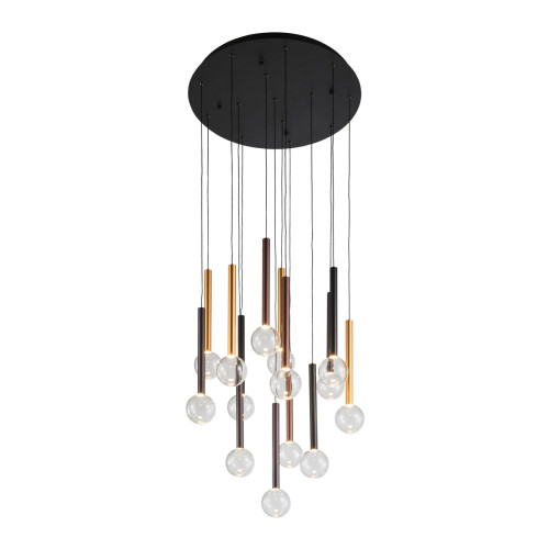 Original LED pendant lamp from the series Alinos, made of a black colour metal base and fourteen cylindrical aluminium bodies in copper, brass and black colour with transparent glass shades in a spherical shape and a built-in 58W 3000K LED with the ability to dimmable via a wall switch. Stylish lamp, suitable for interior lighting of your living room, dining room, bedroom, hotel and restaurant.