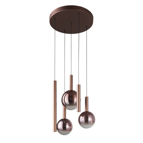Modern LED pendant lamp from the series Camino, made of a copper colour round metal base and five cylindrical aluminium bodies in copper colour with three glass shades in a spherical shape and a built-in 30W 3000K LED with the ability to dimmable via a wall switch. Stylish lamp, suitable for interior lighting of your living room, dining room, bedroom, hotel and restaurant.