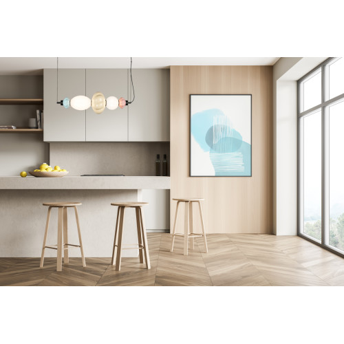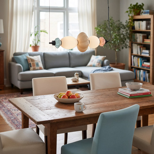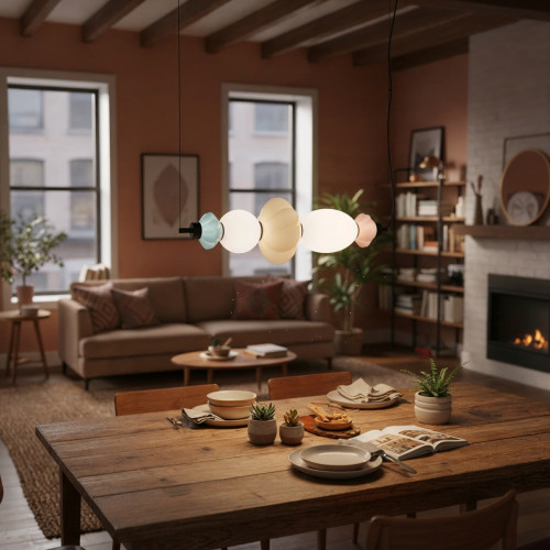 Stylish LED pendant lamp from the series Tordi, made of a black metal base and a geometric body, composed of decorative ceramic elements in beige, pink and blue colour with two opal glass diffusers and a built-in 18W 3000K LED. An attractive lamp, suitable for modern lighting in your living room, dining room, bedroom, hotel and restaurant.