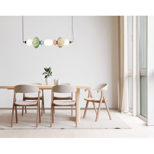 Stylish LED pendant lamp from the series Tordi, made of a black metal base and a geometric body, composed of decorative ceramic elements in beige, green, pink and blue colour with three opal glass diffusers and a built-in 24W 3000K LED. An attractive lamp, suitable for modern lighting in your living room, dining room, bedroom, hotel and restaurant.
