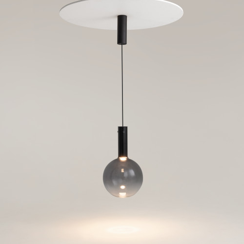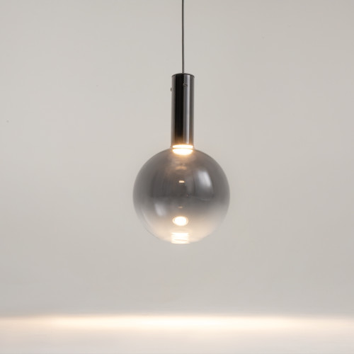 Stylish LED pendant lamp from the series Nebula, made of black colour metal base and smoked spherical blown glass shade with elongated cylindrical base and built-in 6W 3000K LED. Hanging lamp that will add modern style and comfortable light to your living room, dining room, bedroom, hotel and restaurant.