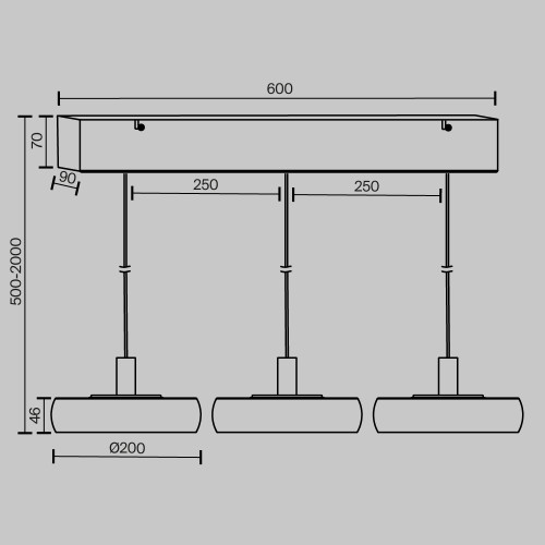 Dimensions: Height: 500mm - 2000mm, Length: 680mm, Width: 200mm, Height of the shades: 46mm, Diameter of the shades: 200mm