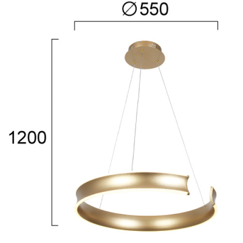 Stylish LED pendant lamp with a modern design from the series Marlen, made of a gold colour round metal base with a metal body in the shape of a ring and silicone diffusers with double-sided light scattering and a built-in 36W, 3000K LED. An original proposal for comfortable lighting in your living room, dining room, office, hotel and restaurant.