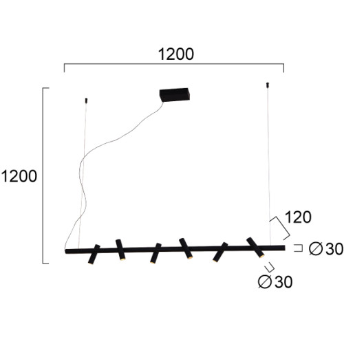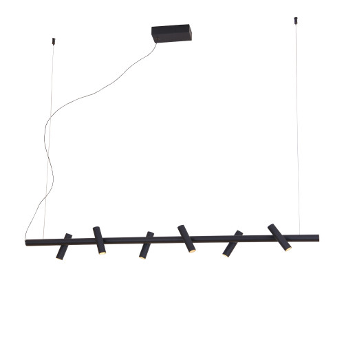 Functional LED pendant lamp from the series Clio, made of a black colour metal base with an arm and six adjustable metal heads in a cylindrical shape with a built-in 29W, 3000K LED. Modern solution for the original lighting in your home, office, hotel and restaurant.