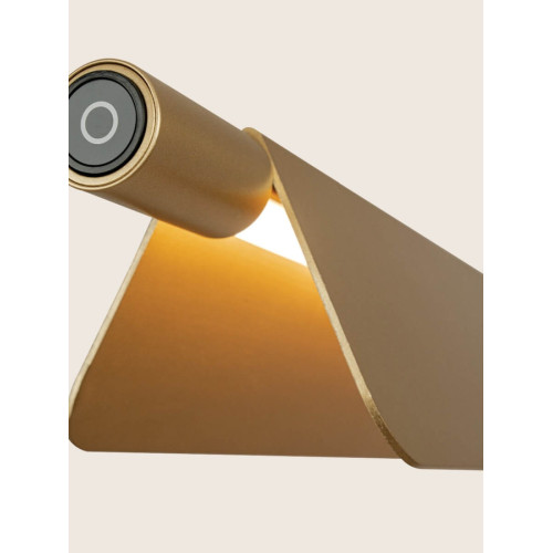 Modern LED floor lamp with a functional design, made of a brushed gold colour metal base and arm wit..