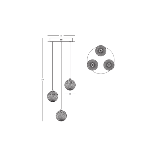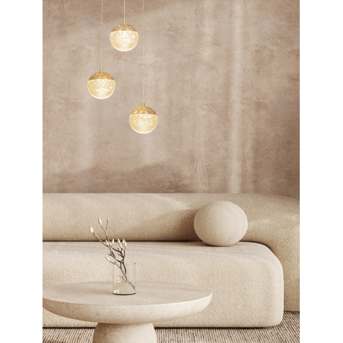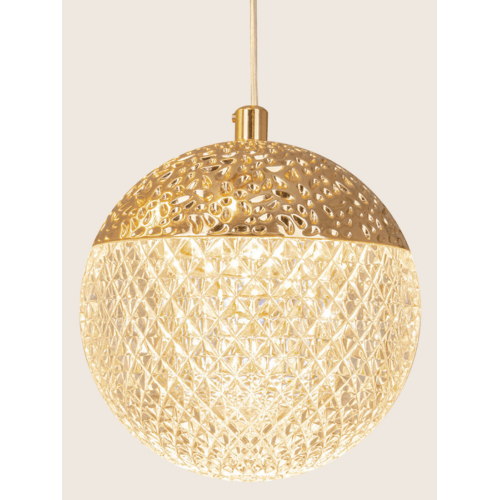Original LED pendant lamp with a modern design, made of a matt gold colour aluminium base and a body of three aluminium shades with transparent acrylic diffusers in a spherical shape, creating a sparkling, crystal effect and a built-in 25W, 3000K LED. The body has a dimmable TRIAC driver. Stylish lamp, suitable for the interior lighting of your living room, dining room, bedroom, hotel or restaurant.