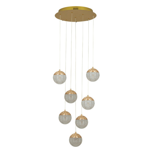 Original LED pendant lamp with a modern design, made of a matt gold colour aluminium base and a body of seven aluminium shades with transparent acrylic diffusers in a spherical shape, creating a sparkling, crystal effect and a built-in 52W, 3000K LED. The body has a dimmable TRIAC driver. Stylish lamp, suitable for the interior lighting of your living room, dining room, bedroom, hotel or restaurant.