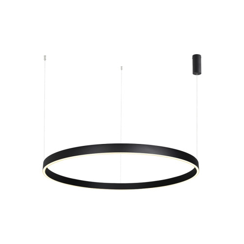 Modern LED pendant lamp with an elegant design, made of a black matt colour aluminium base with a hanging aluminium body in the shape of a ring and a white acrylic diffuser with a built-in 88W, 3000K LED and two-sided light distribution: up and down. The body has a dimmable TRIAC driver. An original proposal for the comfortable lighting of your living room, dining room, bedroom, office, hotel or restaurant.