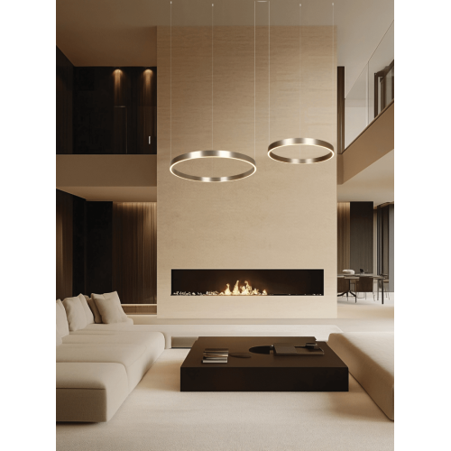 Modern LED pendant lamp with an elegant design, made of a coffee colour aluminium base with a two hanging aluminium bodies in the shape of a ring and a white acrylic diffusers with a built-in 118W, 3000K LED and two-sided light distribution: up and down. The body has a dimmable TRIAC driver. An original proposal for the comfortable lighting of your living room, dining room, bedroom, office, hotel or restaurant.