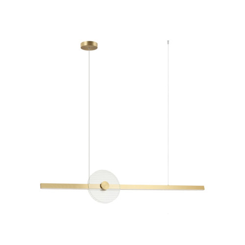Modern LED pendant lamp with an original design, made of gold colour metal base with a hanging linear aluminium body and a clear glass diffuser in the shape of a disk with a built-in 20W, 3000K LED. The body has a dimmable TRIAC driver. Stylish solution for comfortable lighting in your living room, dining room, bedroom, office, hotel or restaurant.